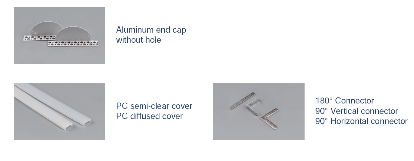 Aluminum end cap with/without hole | PC semi-clear cover / PC diffused cover | 180° Connector / 90° Vertical connector / 90° Horizontal connector
