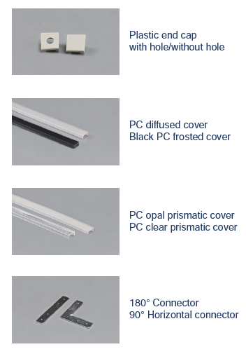 Plastic end cap with hole/without hole | PC diffused cover / Black PC frosted cover | PC opal prismatic cover / PC clear prismatic cover | 180° Connector / 90° Horizontal connector