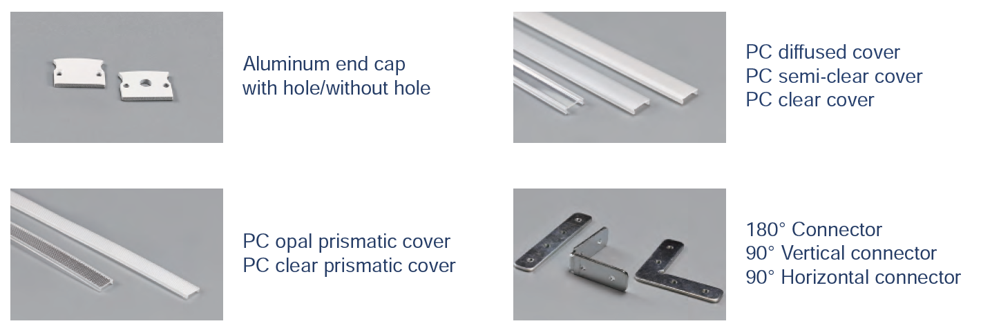 Aluminum end cap with hole/without hole | PC opal prismatic cover / PC clear prismatic cover / PC diffused cover / PC semi-clear cover / PC clear cover | 180° Connector / 90° Vertical connector / 90° Horizontal connector