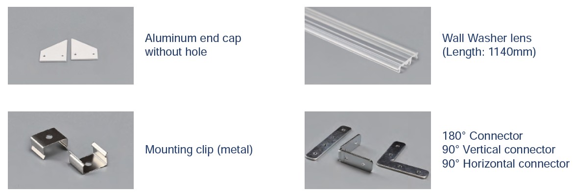 Aluminum end cap with/without hole | Wall Washer lens (Length: 1140mm) | Mounting clip (metal) | 180° Connector / 90° Vertical connector / 90° Horizontal connector