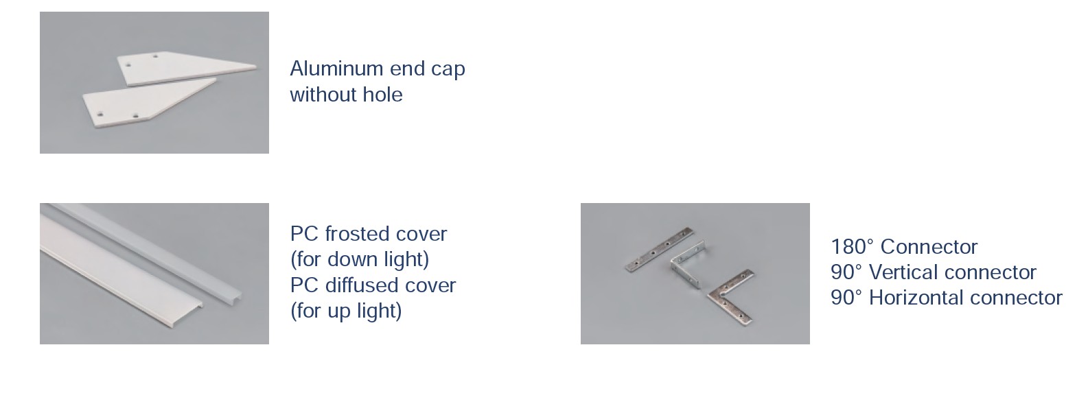 Aluminum end cap with hole | PC frosted cover (for down light) - PC diffused cover (for up light) | 180° Connector - 90° Vertical connector - 90° Horizontal connector