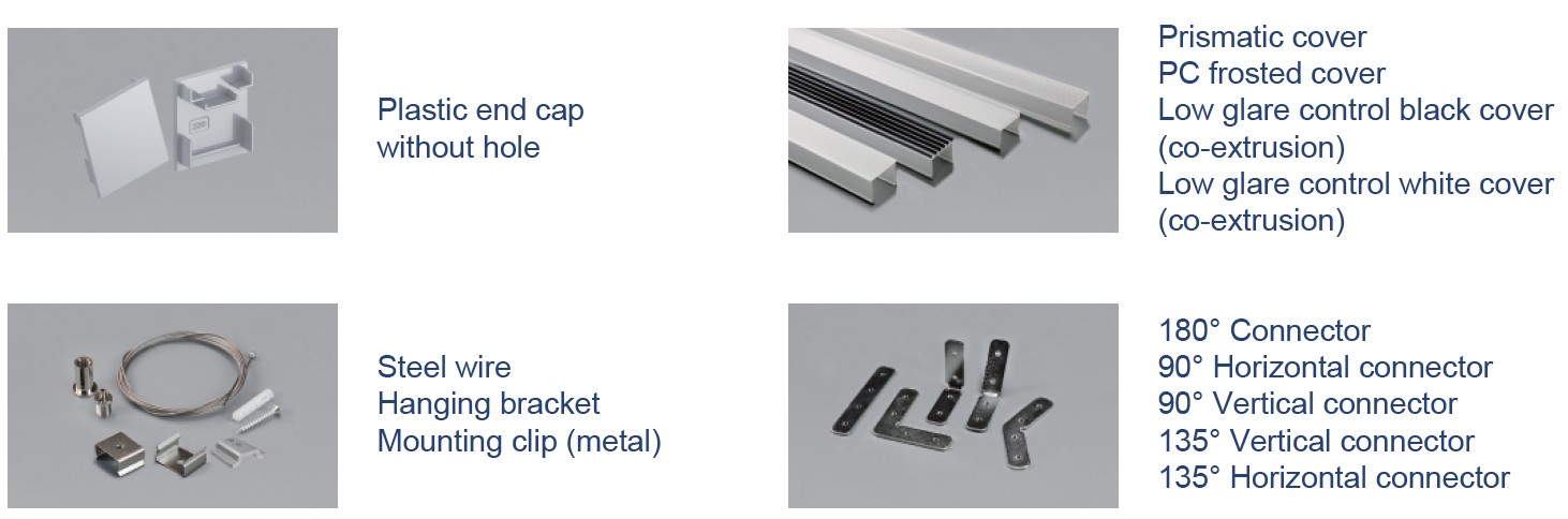 Plastic end cap with/without hole | Prismatic cover / PC frosted cover / Low glare control black cover (co-extrusion) / Low glare control white cover (co-extrusion) | 180° Connector / 90° Horizontal connector 90° / Vertical connector | 135° Vertical connector / 135° Horizontal connector | Steel wire / Hanging bracket / Mounting clip (metal)