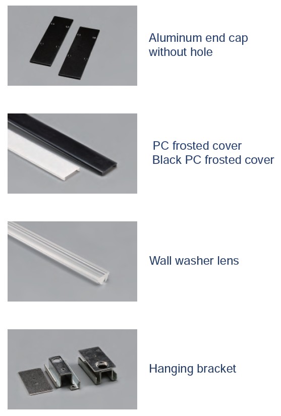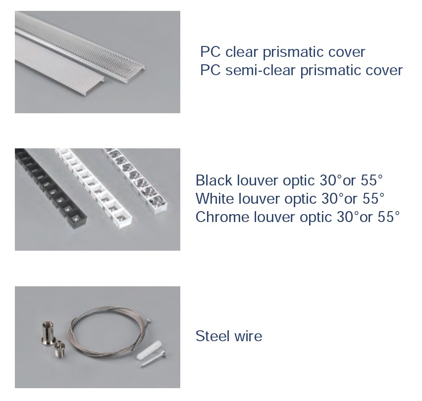 Aluminum end cap with/without hole | PC frosted cover Black PC frosted cover | Wall washer lens | Hanging bracket | PC clear prismatic cover / PC semi-clear prismatic cover | Steel wire | Black louver optic 30°or 55° White louver optic 30°or 55° Chrome louver optic 30°or 55°