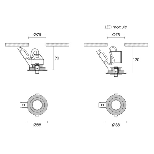 Series of false-ceiling recessed downlights, that can be fixed, adjustable and water resistant (IP44). It is made of die-cast aluminum. It comes in two ring pieces that are tightly placed together with the use of a magnet. This protects the plasterboard during re-lamping since the outer ring remains stable on the ceiling. The adjustable version offers 360 degrees rotation on the horizontal axis. The lamp is placed deep in order to ensure minimum glare. It can house honeycomb louvre. It comes with 12V MR11 / MR16 socket for halogen and led lamps or led module.